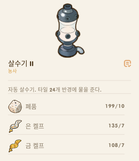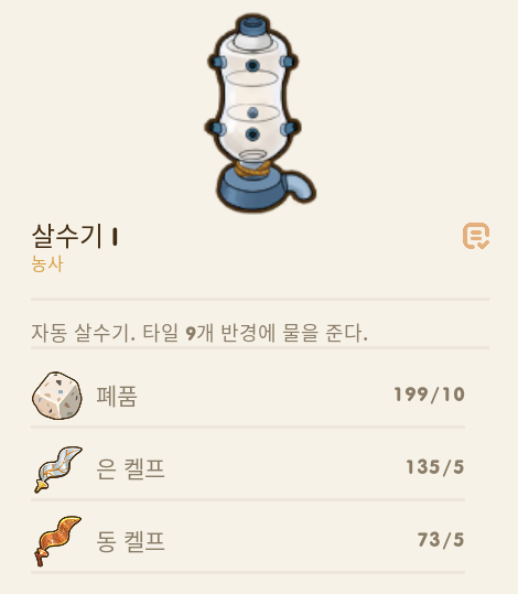 이렇게 각 살수기 마다 재료들이 들어가며 넓은 땅에 농사를 지으려면 많은 재료를 준비해야합니다. 또 높은 등급의 켈프를
